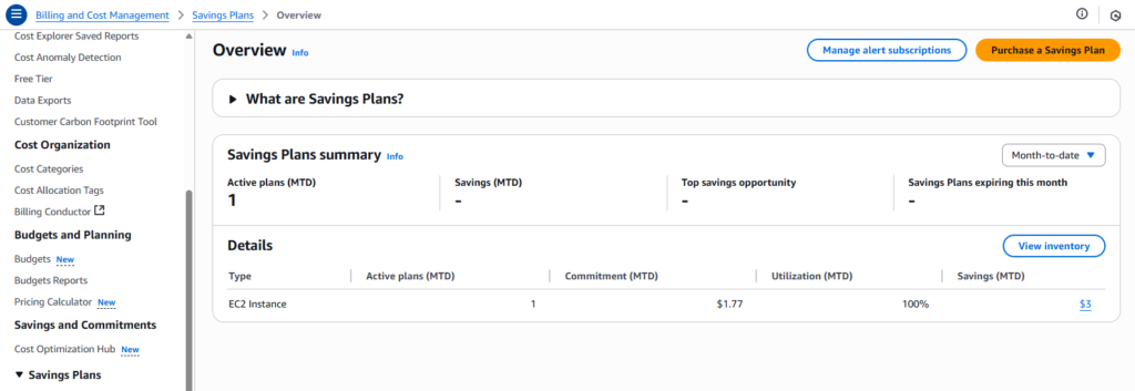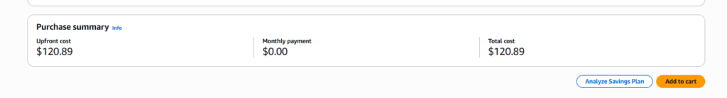 表示された金額も試算と概ね正しそうです。年額40.3$が3年なので120$。Add to Cartでショッピングカートに入れて、あとは購入します(Amazonみたいですね)。購入したプランは、Billing and Cost Management > Savings Plans > Inventory から確認ができます。ちなみに開始日から1週間以内であれば返品も可能なようで、案外気楽に買っても良さげです。