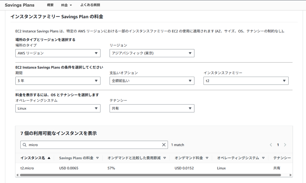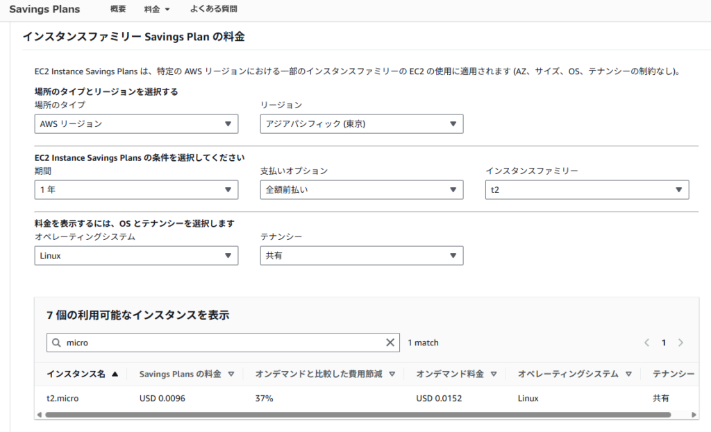 とはいえAWSは従量課金かつ構成の柔軟性があるので、月単位のVPSプランと金額を比較するのも酷です。EC2には年単位で契約できるSavings Plansがあります。その中でも今回はEC2 Instance Savings Plansで料金を改めて確認してみました。リージョンとか前払いする料金の金額とかでも変わってくるので今回は、東京リージョン、一括前払いでチェックします。