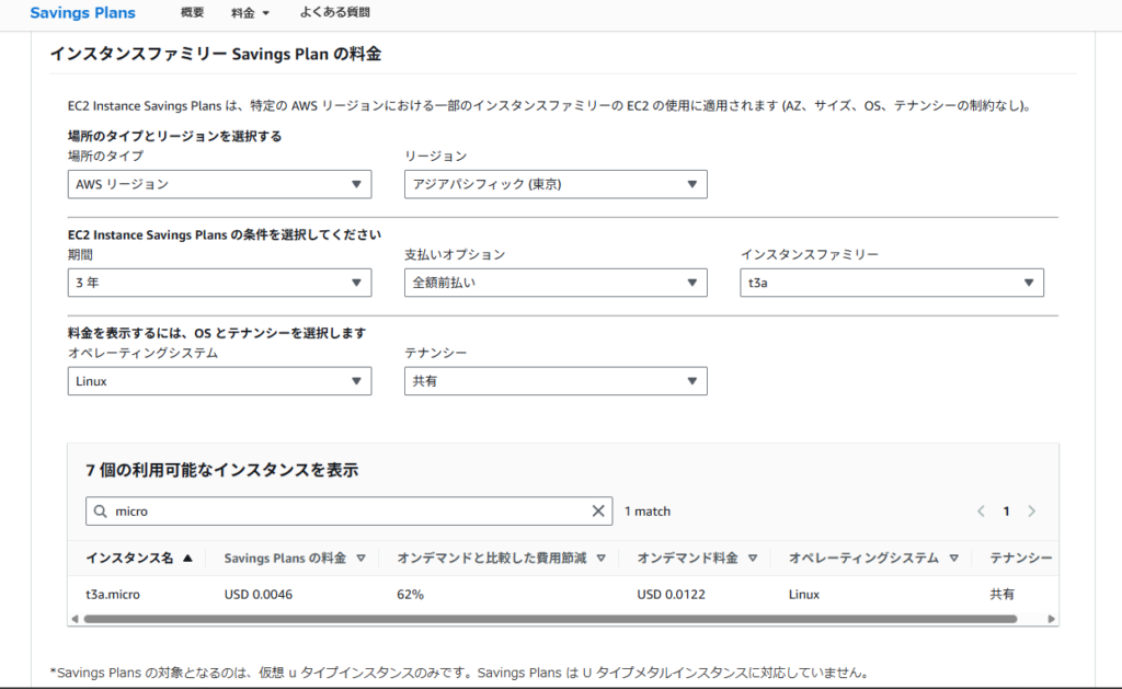 Intel CPUかAMD CPUかという違い(※どちらもx86_64)やその他も差異があるのでWebアプリケーションが正常に動くかどうかが懸念点ですが、実際にインスタンスのタイプを変更して軽く動作確認したところ問題なさそうでした。なので今回は、t3a.microのSavings Plansを3年分買うことにします。