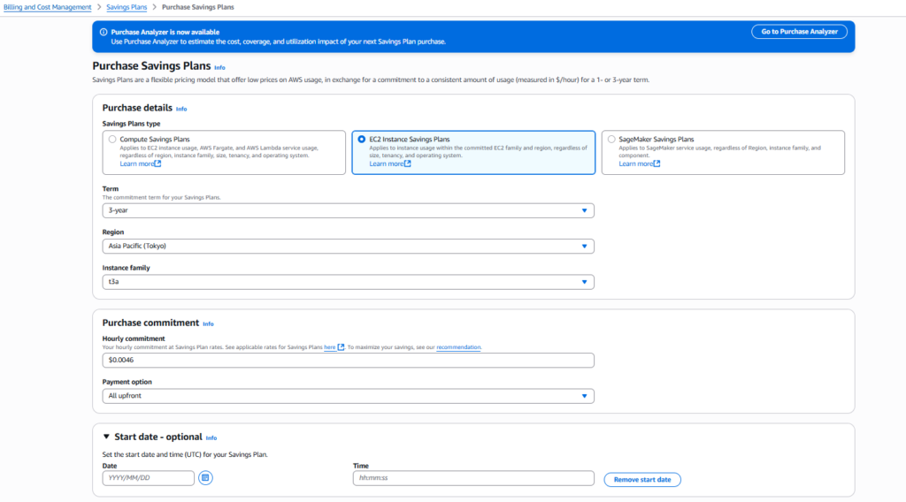 Hourly commitmentはさっき試算の時に使った、時間単位の金額を入れてみました(これ俺が手打ちすんの?とはなりましたが)。Payment optionはAll upfront(一括全払い)です。一部のみ前払いとすると割引率が下がります。ちなみに適用開始日時も指定ができます。9月にFree Tierが切れる予定だったので、2025/9/1 00:00:00とかで指定しました。