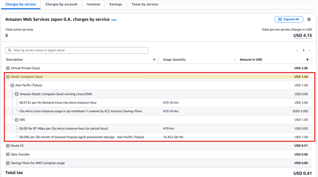 EC2で金かかっとるやないかい!これはインスタンスに割り当てているボリューム(ストレージ)の料金でした。しょっぱいサイトでも多少はかかるんですね。あとはVPCがぼちぼち。18日間で4.15$かかっているので、ざっくり月額7.0$とします。また、この金額には前払いしたEC2インスタンス自体の料金は含まれていません。t3a.microは割引適用後の月額が約3.4$でしたね。合計で月額10.4$(1,564円)になります。